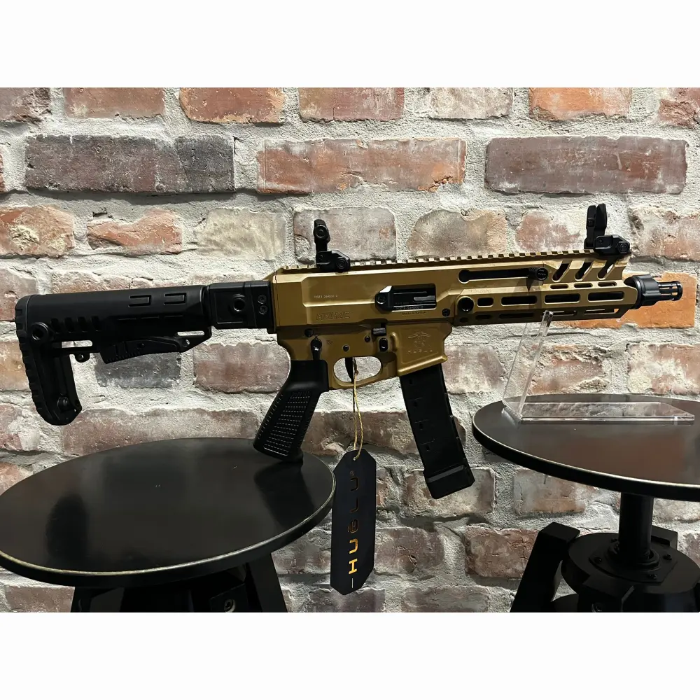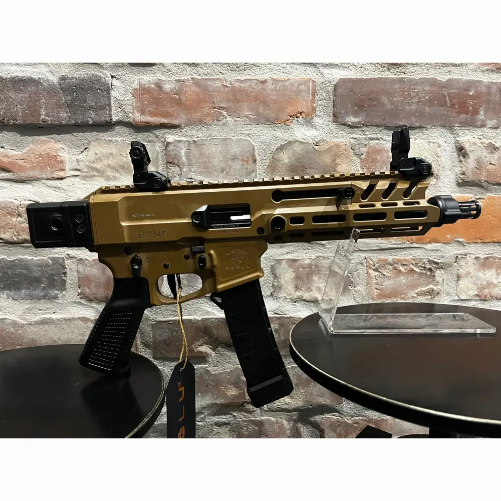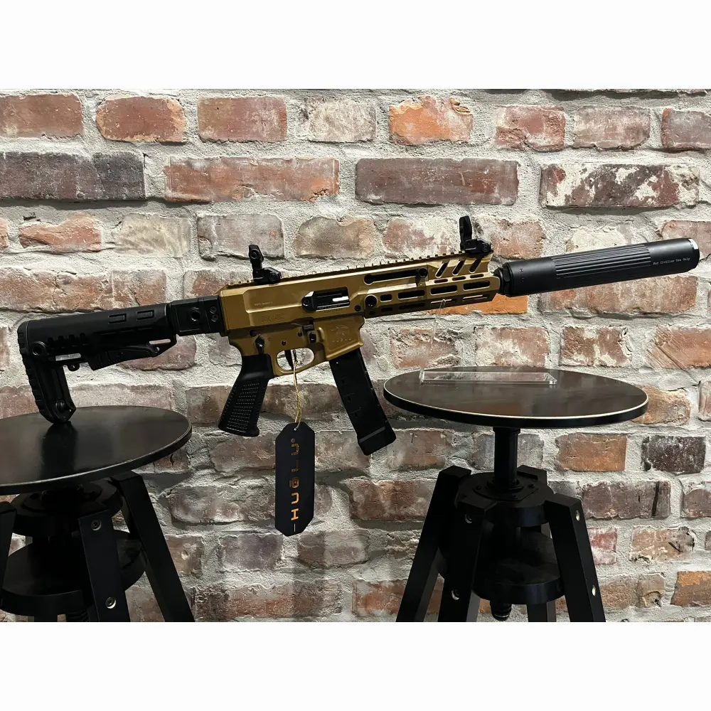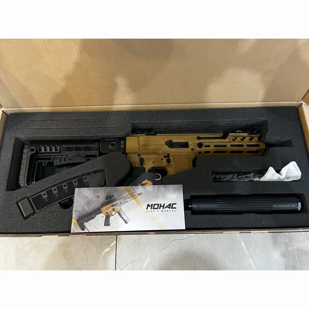 Pistolet samopowtarzalny Huglu Mohac kal. 9x19mm PCC FDE, z lufą 8". Kolba rozkładana, rozsuwana w 5 pozycjach, 2x magazynek w standardzie: CZ evo 3+, okładziny szyny x3, przyrządy celownicze, chwyt w milspecu, obustronne manipulatory, skok w lufie 1:10, ilość bruzd 6, gwint na lufie 1/2x28 UNEF, standard milspec do AR