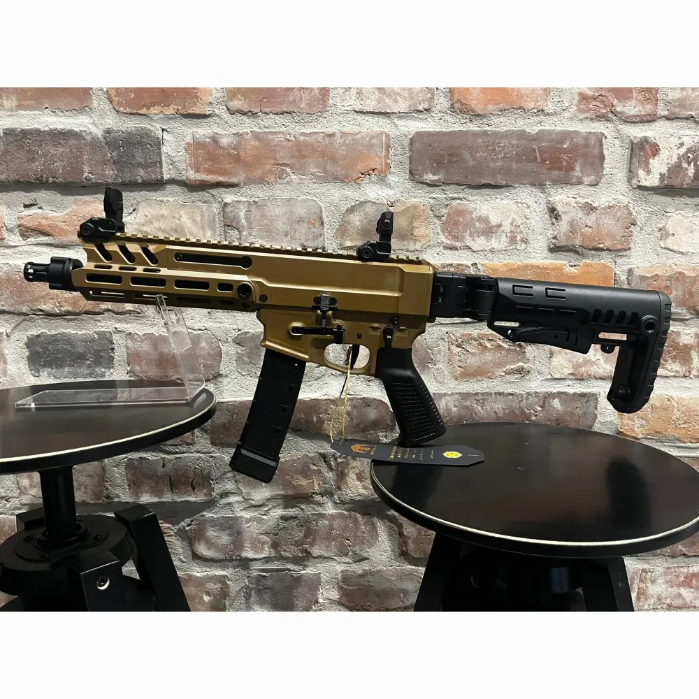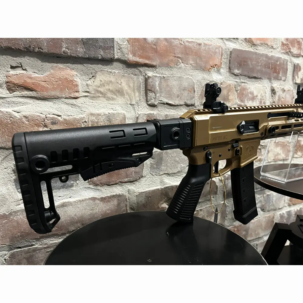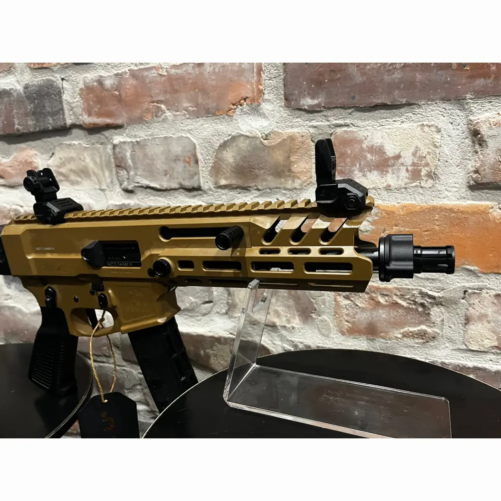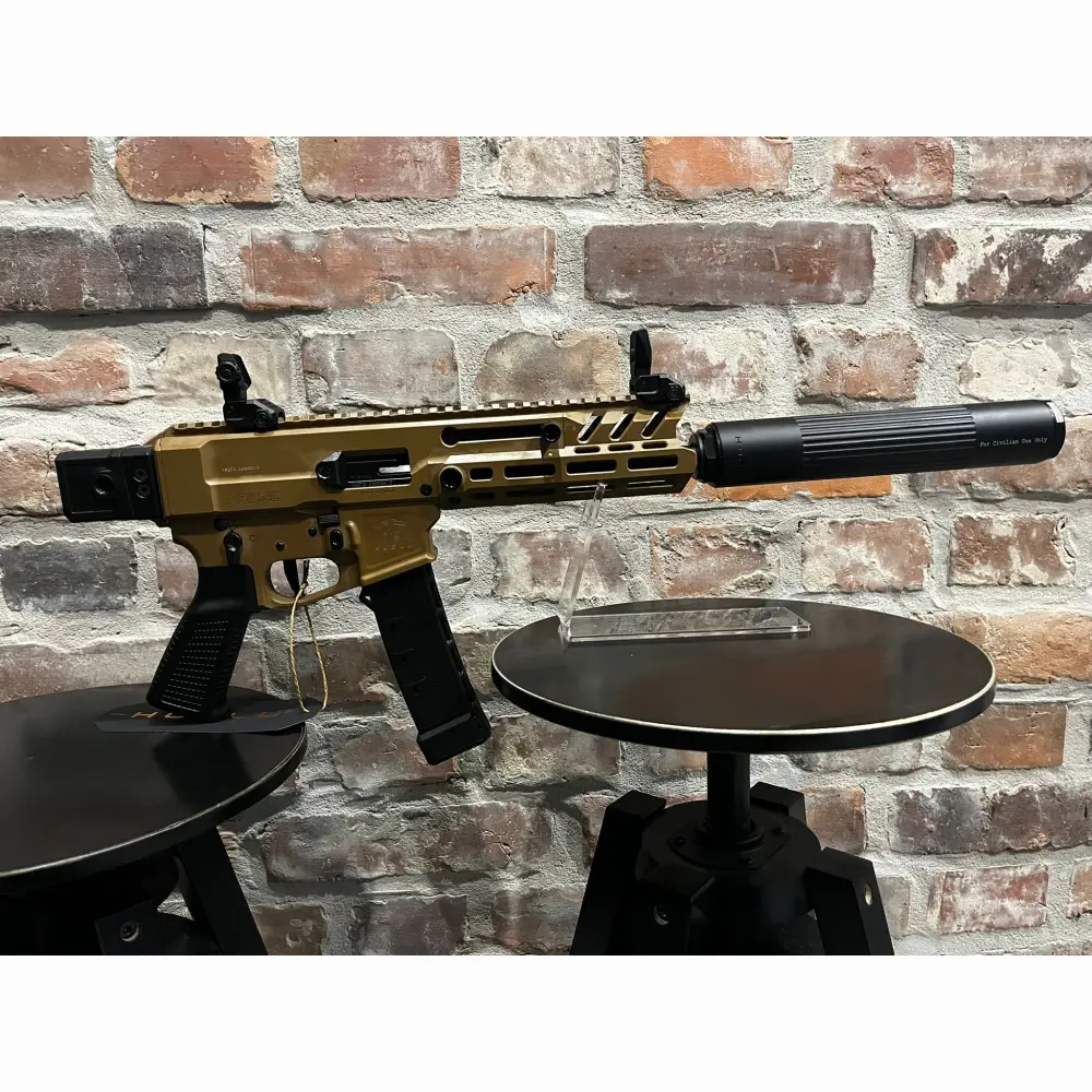 Pistolet samopowtarzalny Huglu Mohac kal. 9x19mm PCC FDE, z lufą 8". Kolba rozkładana, rozsuwana w 5 pozycjach, 2x magazynek w standardzie: CZ evo 3+, okładziny szyny x3, przyrządy celownicze, chwyt w milspecu, obustronne manipulatory, skok w lufie 1:10, ilość bruzd 6, gwint na lufie 1/2x28 UNEF, standard milspec do AR